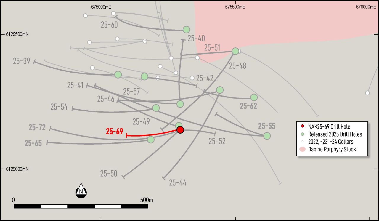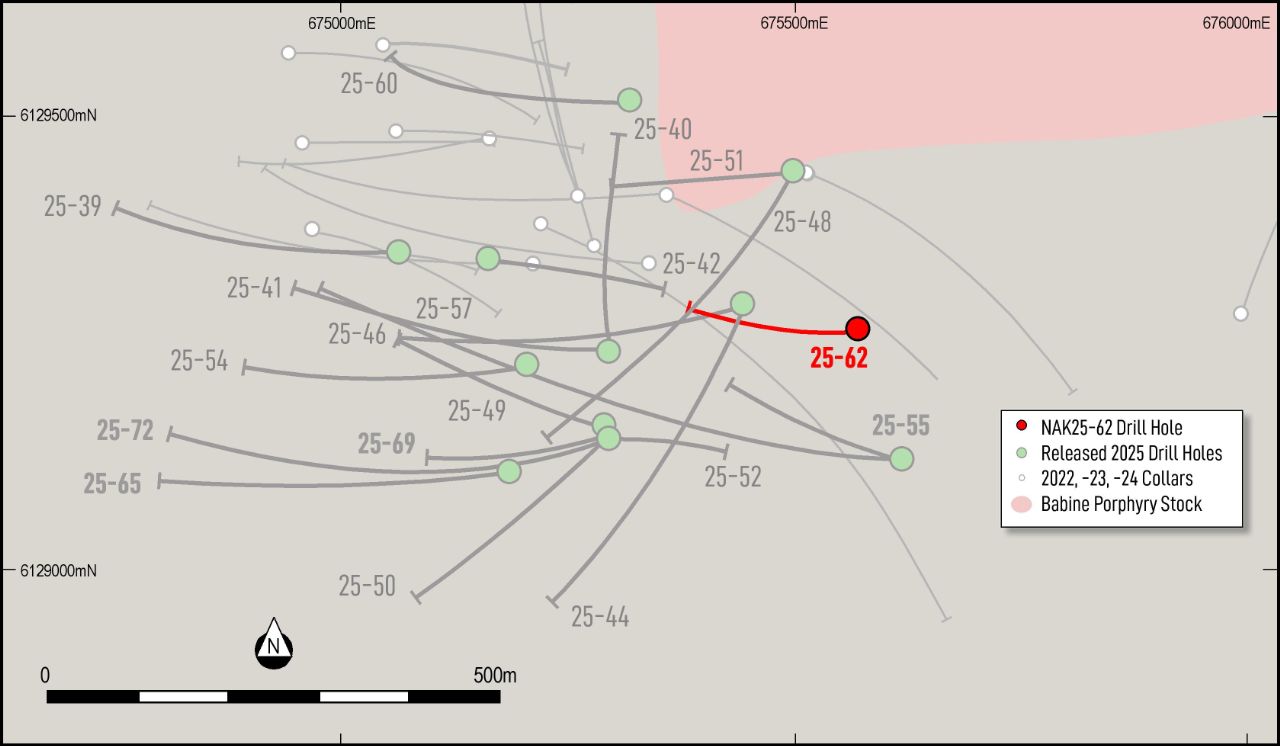 NAK25-62 was collared approximately 150 m to the east of NAK25-46 and drilled steeply to the west. This hole was designed to expand the known extent of South Zone mineralization to the east of the tested zone. NAK25-62 collared into interbedded siltstone, sandstone, and conglomerate, before transitioning into a well mineralized package of sandstone at a depth of 75 m. Concordant with the Company’s modelling, mineralization, consisting of disseminated and vein hosted chalcopyrite remained strong to a depth of 264 m, where the hole transitioned to a thinly bedded, less well mineralized package of fine-grained sedimentary rock. Disseminated chalcopyrite mineralization abruptly increases in abundance below this unit, at a depth of 480 m, coinciding with a transition to the well constrained mineralized conglomerate. As the hole traversed deeper, sulfide speciation gradually shifted to pyrite/pyrrhotite dominant, bottoming in concretion-bearing fine sandstone cut by narrow mafic dyking.
