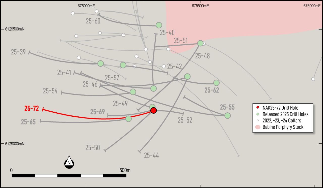 NAK25-55 was collared approximately 150 m south-southeast of NAK25-62 and drilled steeply to the west-northwest. The hole was designed to test both near surface and deep mineralization beyond the southeastern extent of drilling in the South Zone. The hole collared into interbedded sandstone and siltstone with subordinate lenses of conglomerate, to a depth of 300 m, where the hole’s first instance of fine grained mafic intrusive was encountered. The mafic unit continued to a depth of 400 m, where the hole transitioned into sparsely feldspar phyric porphyry dyking followed by conglomerate. Conglomerate predominated to a depth of 600 m, where thin beds of sandstone were interspersed with numerous intervals of fine grained mafic intrusive rock, which remained the dominant lithology to end of hole. Mineralization in NAK25-55 consisted of sparse chalcopyrite disseminations and stringers, primarily confined to sandstone and conglomerate lithologies, with local punctuations of vein hosted bornite confined to narrow zones within the lower intercept of mafic dyking.