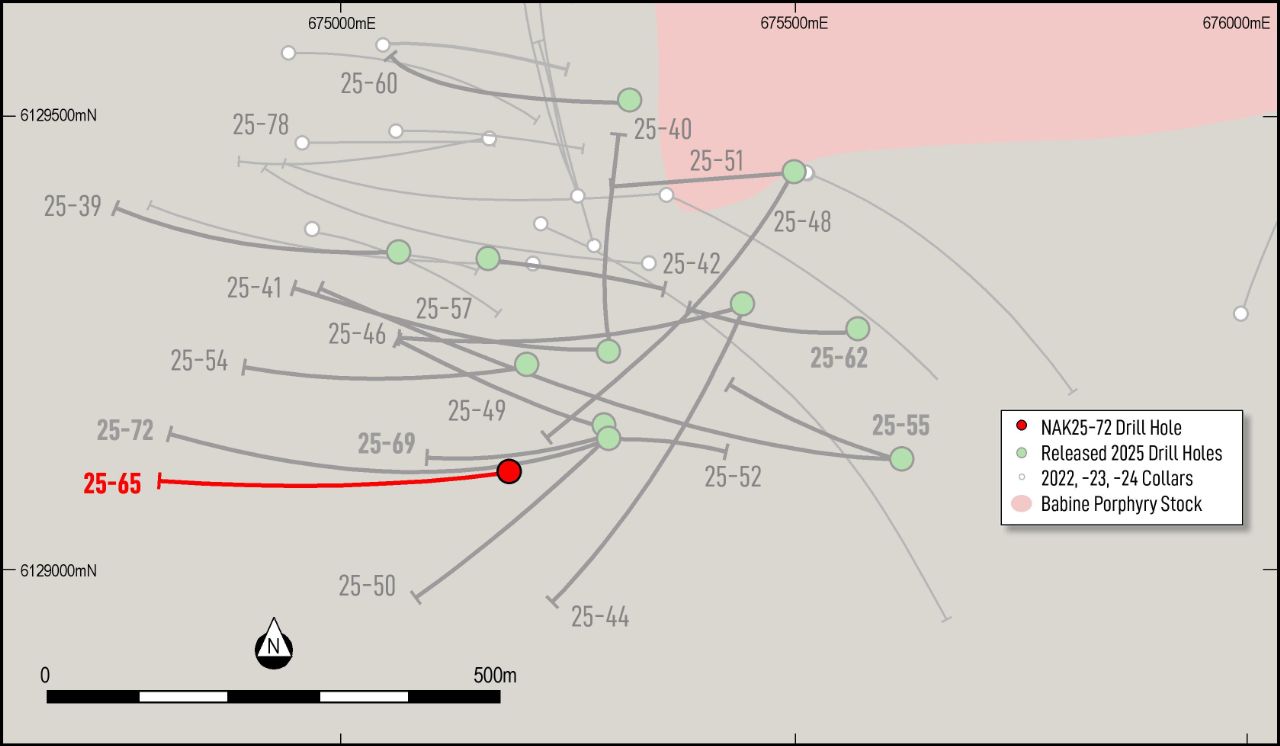 NAK25-65 was collared approximately 120 m west-southwest of NAK25072/69, designed to test the southwestern limits of known South Zone mineralization. This hole encountered a similar association of interbedded coarse to fine sedimentary rocks, transitioning to conglomerate, and finally sandstone, as described above in NAK25-72 and 69. Similarly to NAK25-72, the best mineralization was strongly associated with narrow intervals of feldspar phyric porphyry dyking, intruding weakly mineralized sedimentary host rocks. Sulfide speciation within the sedimentary units transitions from chalcopyrite-pyrite to pyrite dominant as the hole traversed farther to the west, and consistent with drilling elsewhere at NAK, the hole was terminated when pyrite was observed to be the dominant disseminated sulfide.
