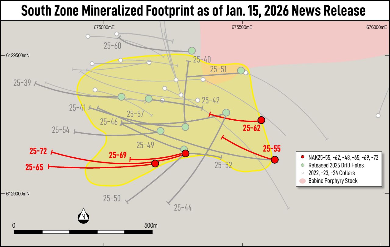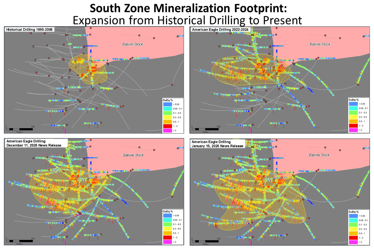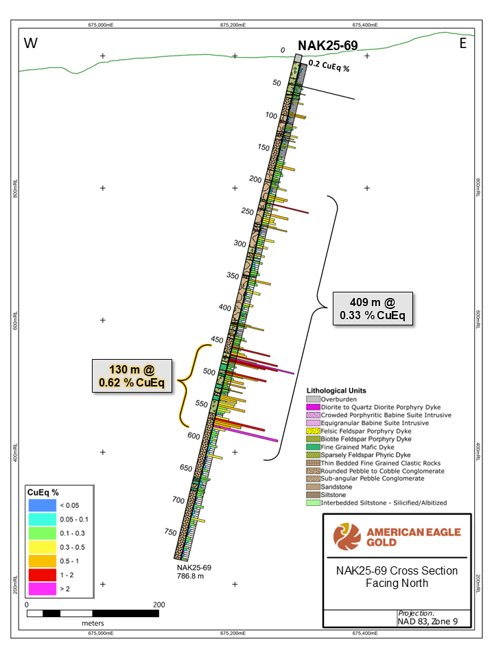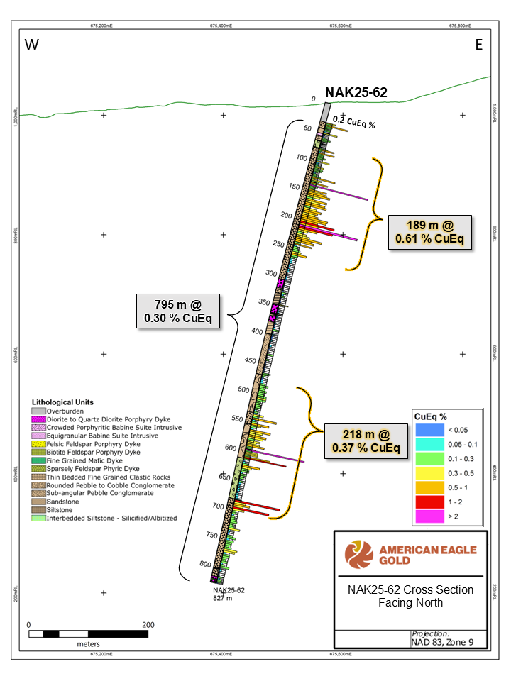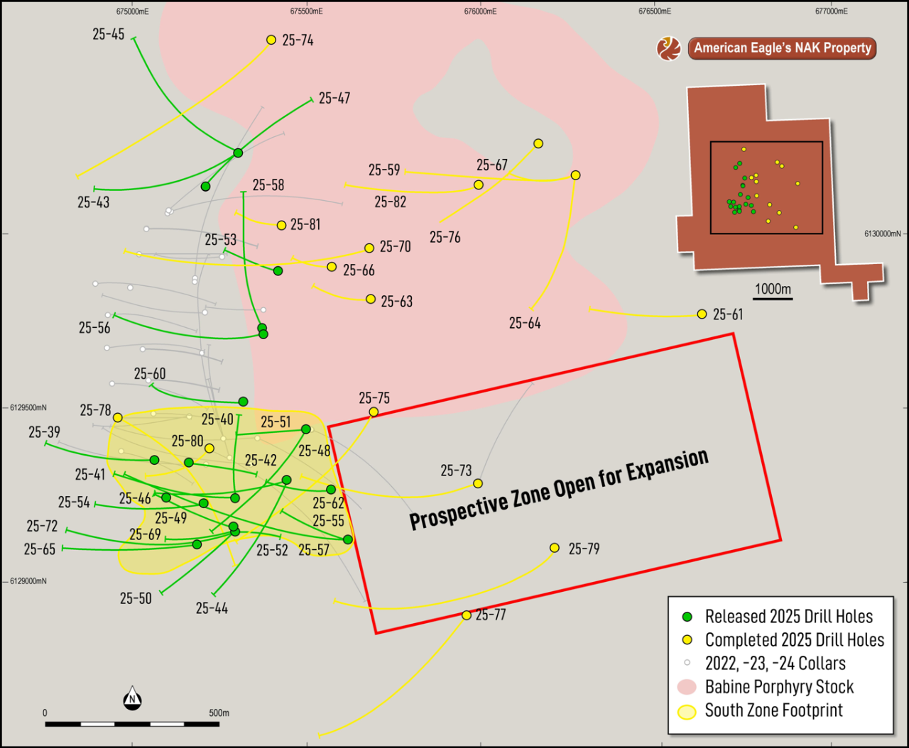Toronto, Ontario – January 15, 2026 – American Eagle Gold Corp. (TSXV: AE) ("American Eagle" or the "Company") is pleased to announce drill results that further expand the South Zone at its NAK copper-gold project in British Columbia. Holes NAK25-55 and NAK25-62 extend shallow mineralization nearly 150 meters east-southeast, while NAK25-69 and NAK25-72 expand it 150 meters to the west-southwest. Notably, NAK25-55 and -62 highlight near-surface mineralization along the southern edge of the Babine porphyry stock shown in Figure 1. Additionally, Figure 2 highlights the South Zone growth achieved through the drill results presented in this release.