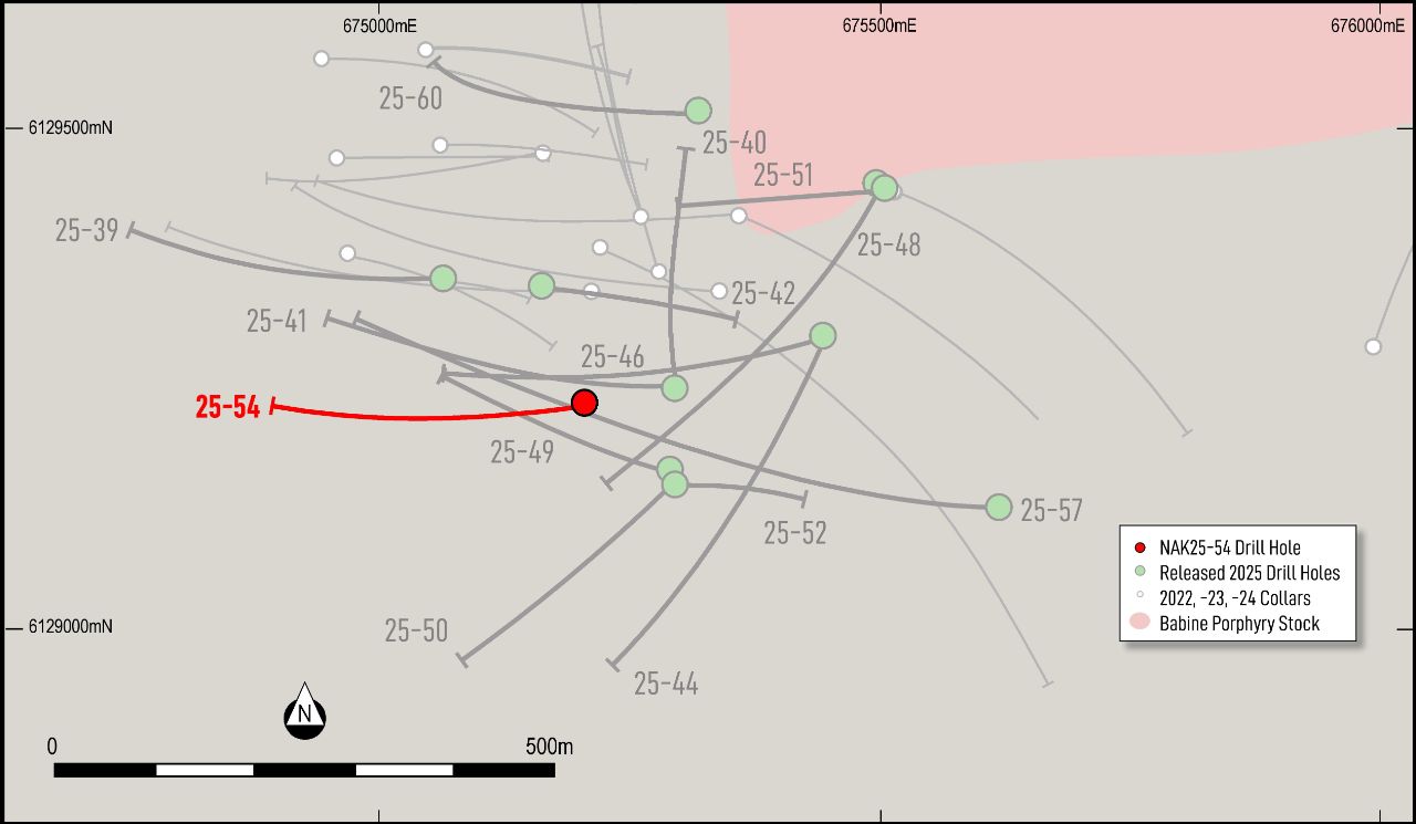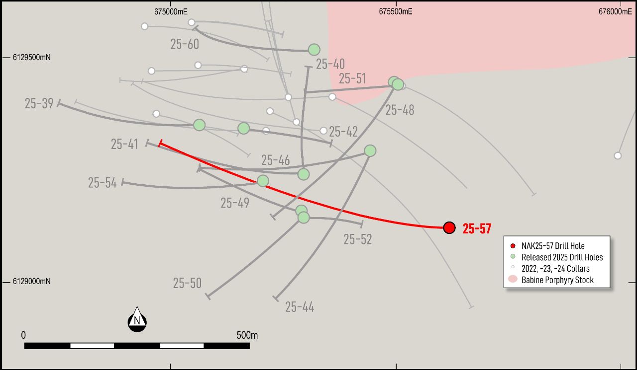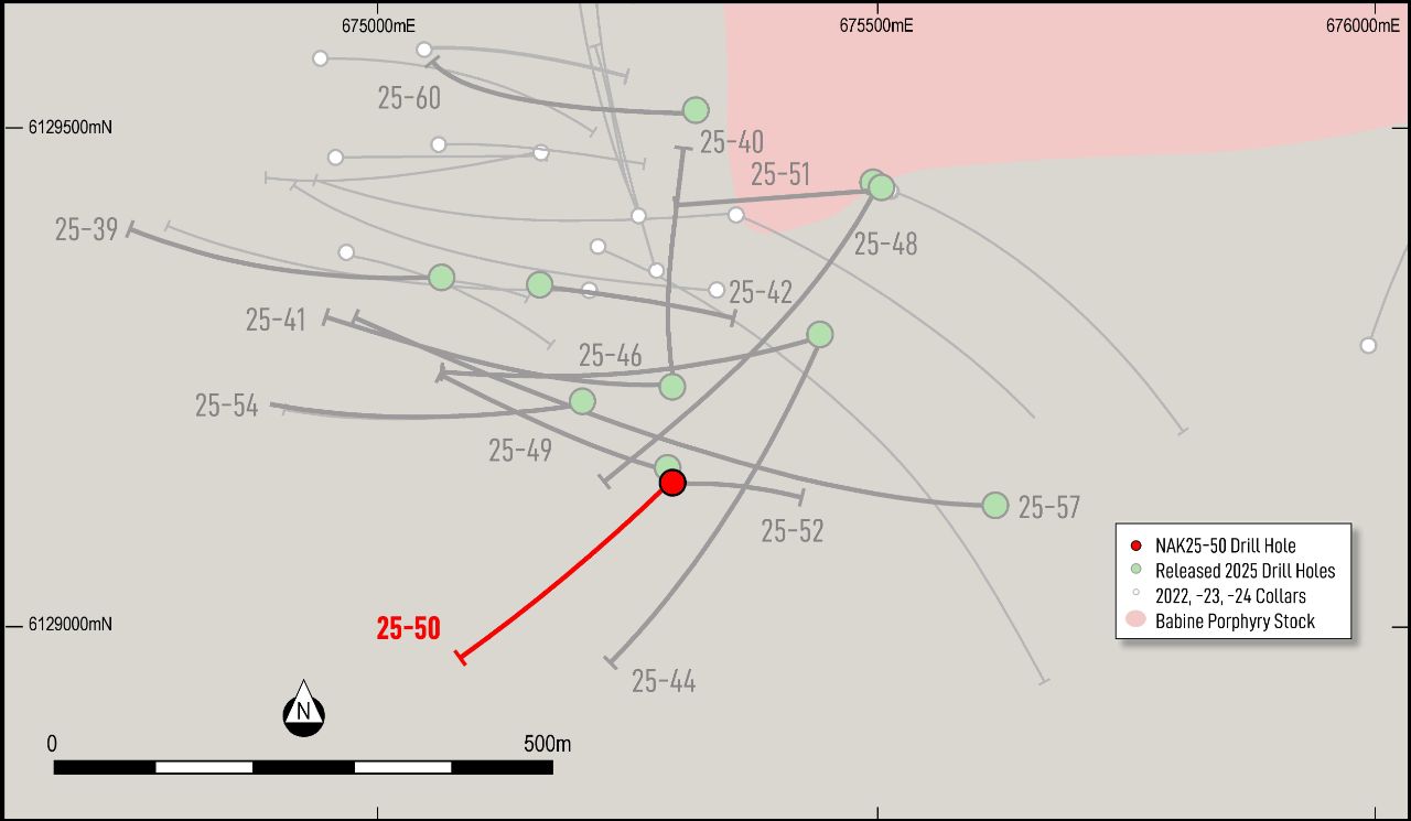 The location of the strongest mineralization in this hole pushes the known extent of deep, high-grade mineralization over 100 m west of the strong zone intersected in NAK25-46. The zone remains open at depth to the north, where there has been little testing of what appears in part to be a sub-horizontal higher grade body.
