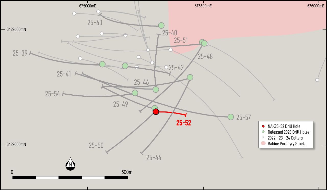 NAK25-51 was collared from the same location as NAK25-48, and drilled shallowly to the west. It was designed, in part, to help test the eastern and northern limits to near-surface, high-grade mineralization at the historical South Zone. The hole returned an intercept of moderate grade from consistent copper- and gold-bearing vein mineralization from surface to a depth of 111 m, where more sparsely mineralized rocks of the Babine porphyry stock were encountered.
