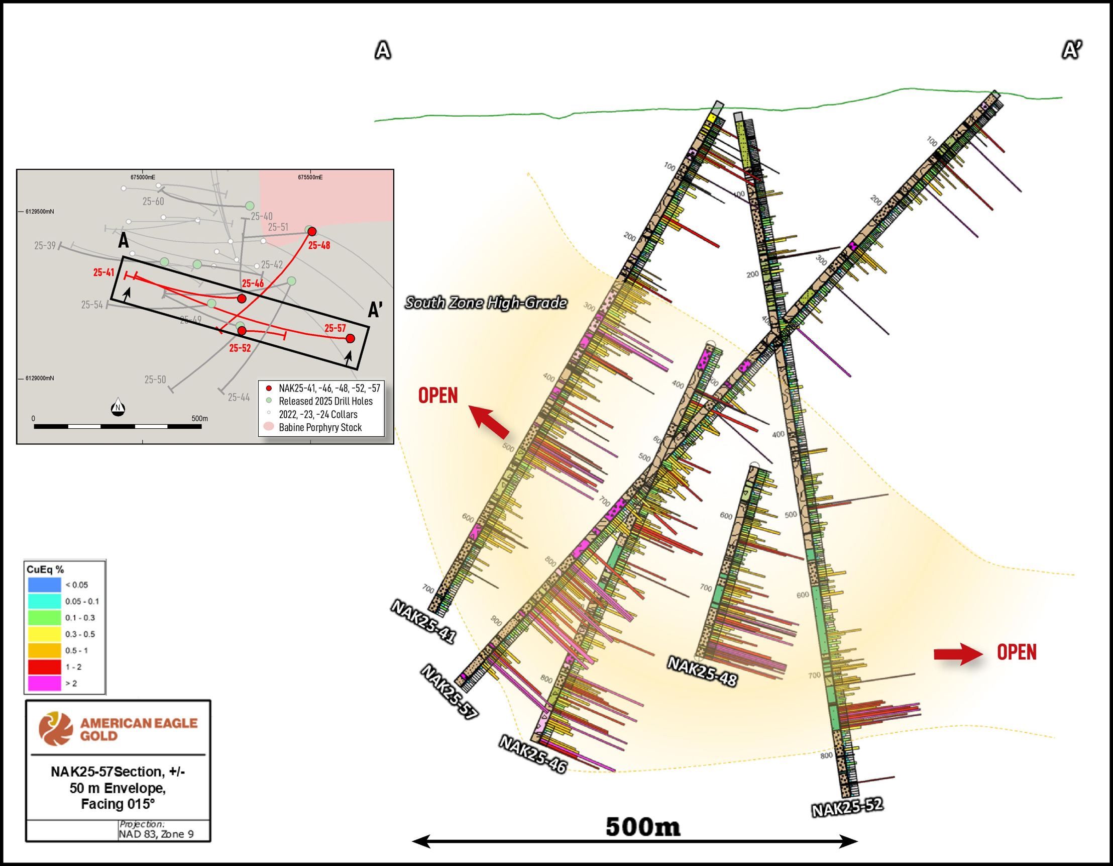 Toronto, Ontario – December 11, 2025 – American Eagle Gold Corp. (AE:TSXV | OTCQB: AMEGF) (“American Eagle” or the “Company”) is pleased to report that recent drilling has expanded the high-grade South Zone at its NAK copper-gold porphyry project in British Columbia, Canada.