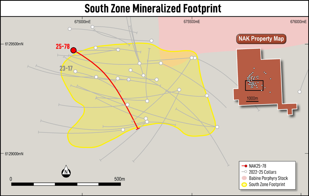 Drill hole NAK25-78 intersected 802 metres of 0.71% Copper Equivalent (“CuEq”) from surface, including 375 metres of 1.01% CuEq beginning 211 metres downhole, confirming a broad, high-grade mineralized system with strong continuity across previously untested areas. The results increase the overall size of the South Zone and successfully connect multiple high-grade discoveries made earlier in the 2025 drill season, while demonstrating a significant expansion of the known highest-grade part of the system.