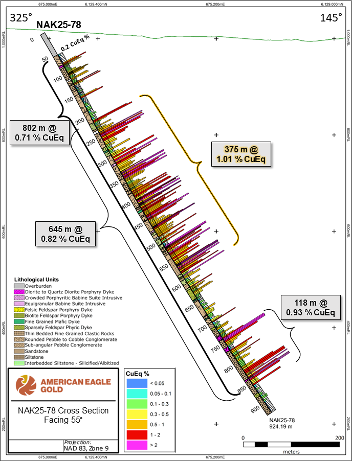 The NAK Project lies within the Babine copper-gold porphyry district of central British Columbia. It has excellent infrastructure through all-season roads and is close to the towns of Smithers, Houston, and Burns Lake, B.C., which lie along a major rail line and Provincial Highway 16. Historical drilling and geophysical, geological, and geochemical work at NAK, which began in the 1960's, tested only to shallow depths. Still, the work revealed a very large near-surface copper-gold system that measures over 1.5 km x 1.5 km. Drilling completed by American Eagle in 2022, 2023, and 2024 returned significant intervals of high-grade copper-gold mineralization that reached beyond and much deeper than the historical drilling, indicating that zones of near-surface and deeper mineralization, locally with considerably higher grades, exist within the broader NAK property mineralizing system. American Eagle Gold completed an aggressive 31,500 metre drill program in 2025 designed to expand and improve the mineral footprint; assays are currently being received.