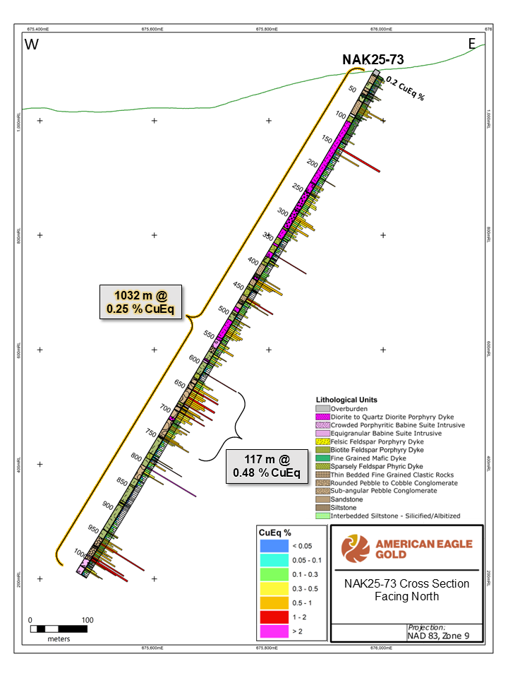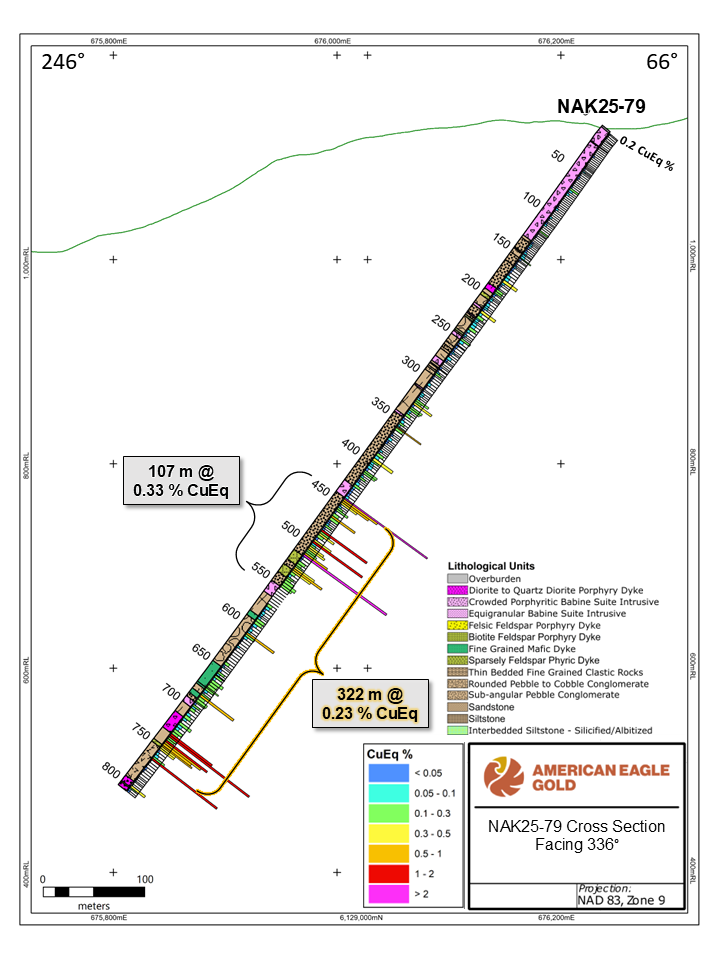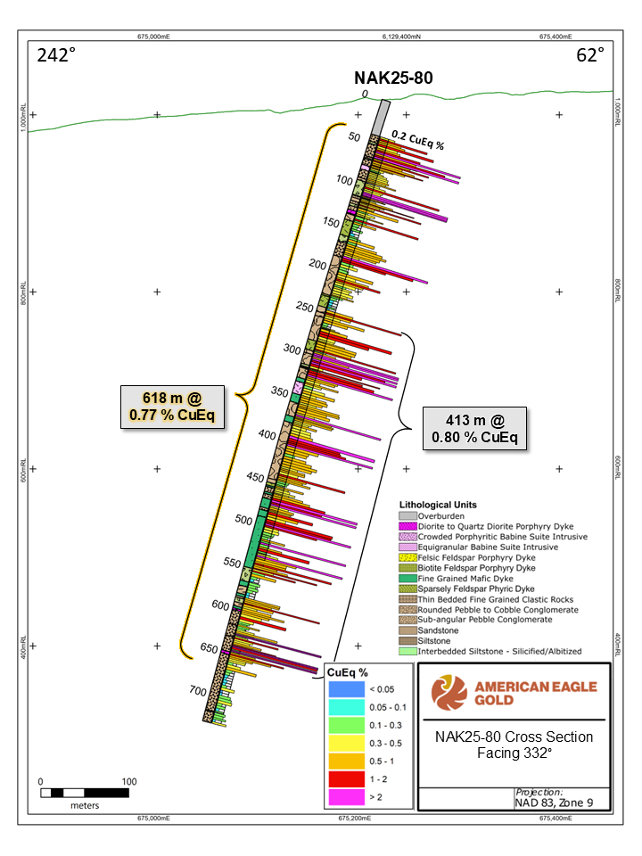 Toronto, Ontario – February 27, 2026 – American Eagle Gold Corp. (the "Company" or "American Eagle") (AE: TSXV, AMEGF: OTCQB) reports new drill results from its 100%-owned NAK Project that further de-risk and expand the South Zone while reinforcing NAK’s emerging district-scale growth profile. These results follow the Company’s February 25, 2026 release, which demonstrated continuous stock-hosted mineralization over a 1.7 km east-west trend, complementing this significant expansion by further extending mineralization over 500 m south of the Babine porphyry stock.