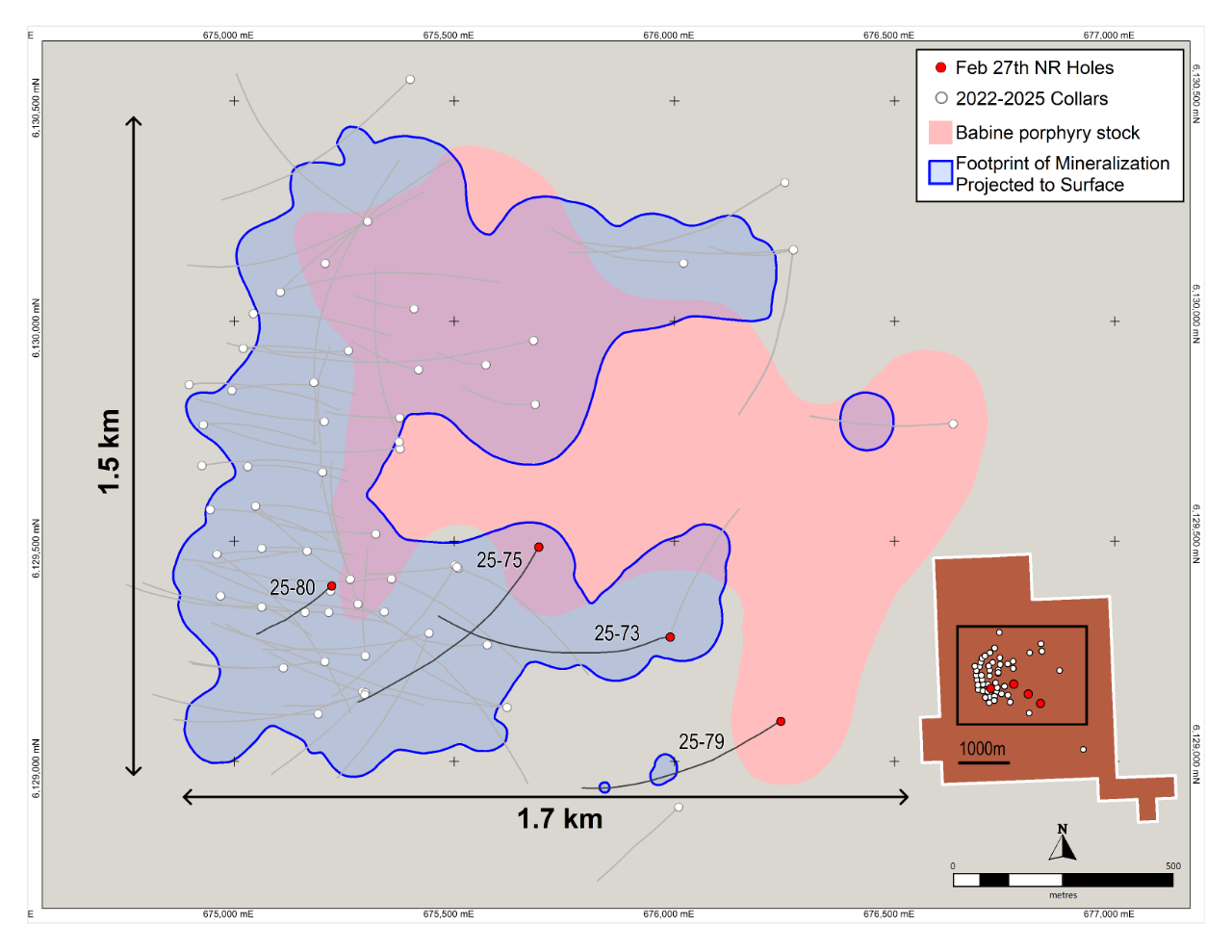 Importantly, step-out drilling to the east (NAK25-73, NAK25-75, and NAK25-79) indicates a connected mineralized corridor along the southern margin of the Babine porphyry stock that can now be traced for at least ~750 m eastward from the South Zone/Main Zone area, and ~500 m to the south. This materially increases the mineralized footprint of the South Zone and leaves the corridor open to further expansion to the east and south.