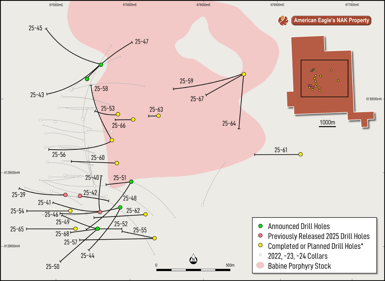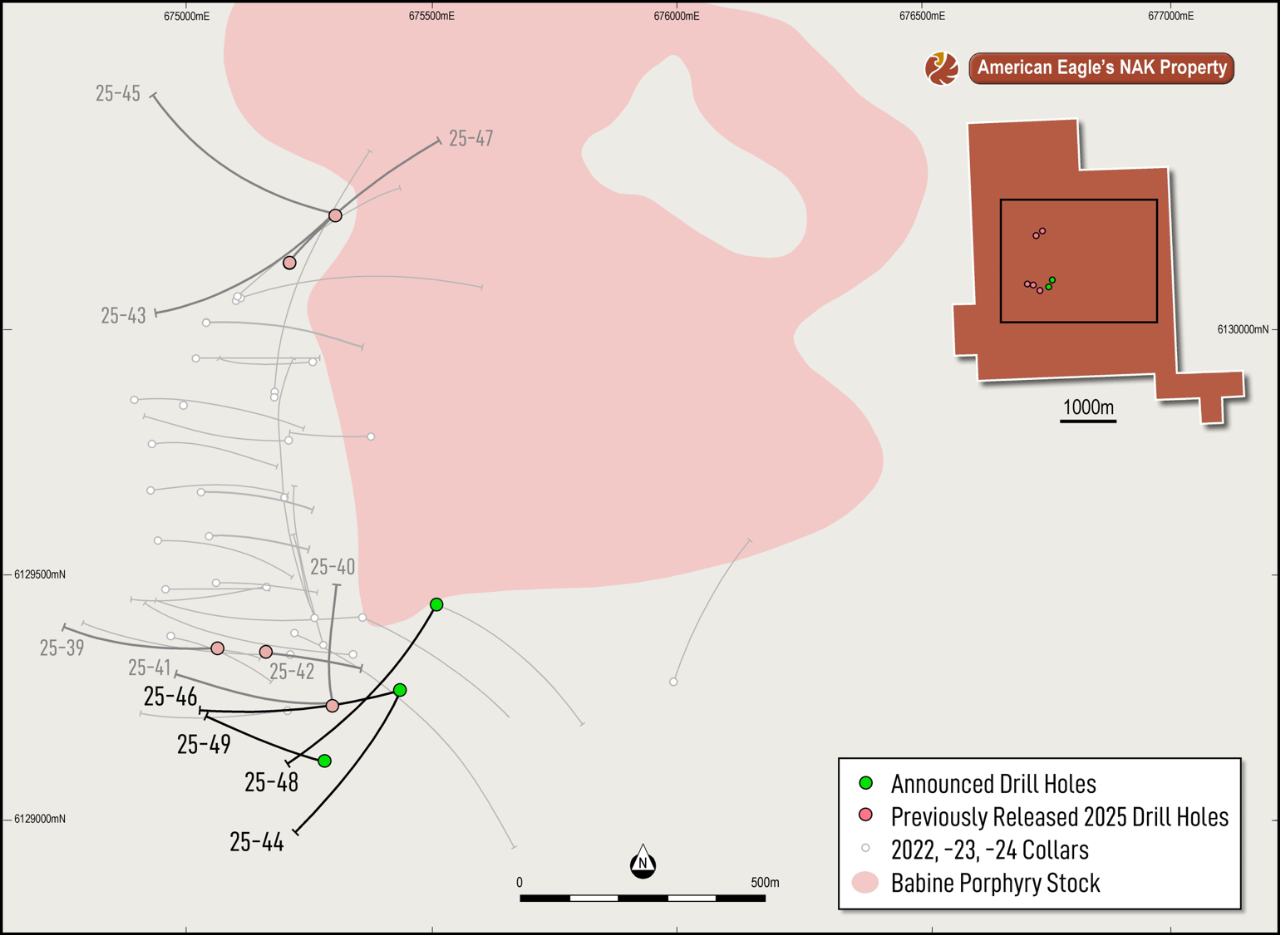 The NAK Project lies within the Babine copper-gold porphyry district of central British Columbia. It has excellent infrastructure through all-season roads and is close to the towns of Smithers, Houston, and Burns Lake, B.C., which lie along a major rail line and Provincial Highway 16. Historical drilling and geophysical, geological, and geochemical work at NAK, which began in the 1960's, tested only to shallow depths. Still, the work revealed a very large near-surface copper-gold system that measures over 1.5 km x 1.5 km. Drilling completed by American Eagle in 2022, 2023, and 2024 returned significant intervals of high-grade copper-gold mineralization that reached beyond and much deeper than the historical drilling, indicating that zones of near-surface and deeper mineralization, locally with considerably higher grades, exist within the broader NAK property mineralizing system. Drilling is currently in progress, with over 16,500 metres drilled across 26 holes out of the planned 30,000-metre drill program. Three drills are actively operating, including one helicopter-supported hole, and expected to continue into December.