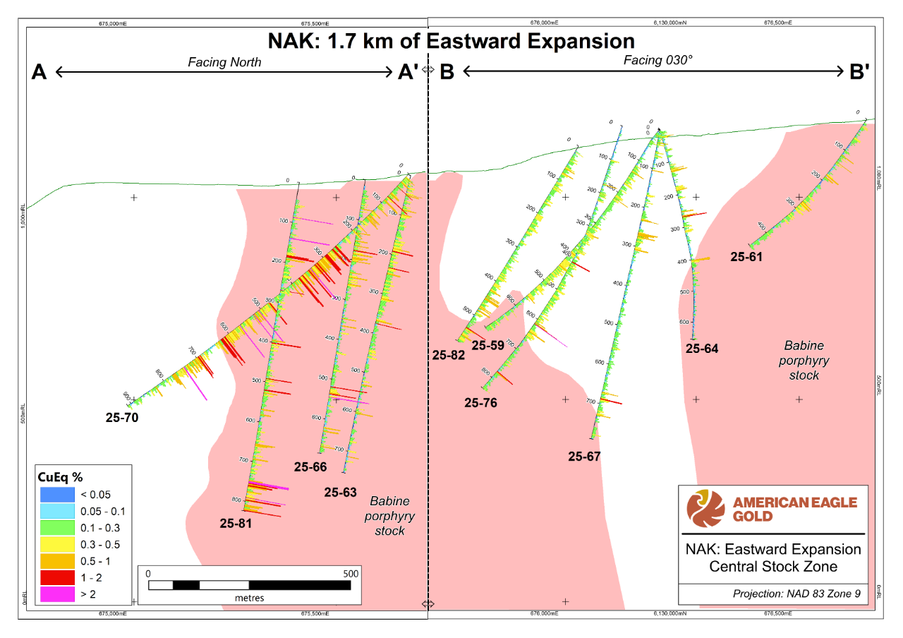 “These results fundamentally change how we view NAK,” said Anthony Moreau, CEO of American Eagle Gold. “What was previously interpreted as barren Babine stock has now demonstrated continuous copper-gold mineralization from surface over very large distances. With mineralization confirmed across approximately 1.7 kilometres east–west and 1.5 kilometres north–south and is still open. The potential scale of this system has expanded dramatically. While we remain at the exploration stage, the dimensions and consistency we’re seeing are characteristic of large porphyry systems and provide a clear technical foundation for aggressive, systematic follow-up drilling.”
