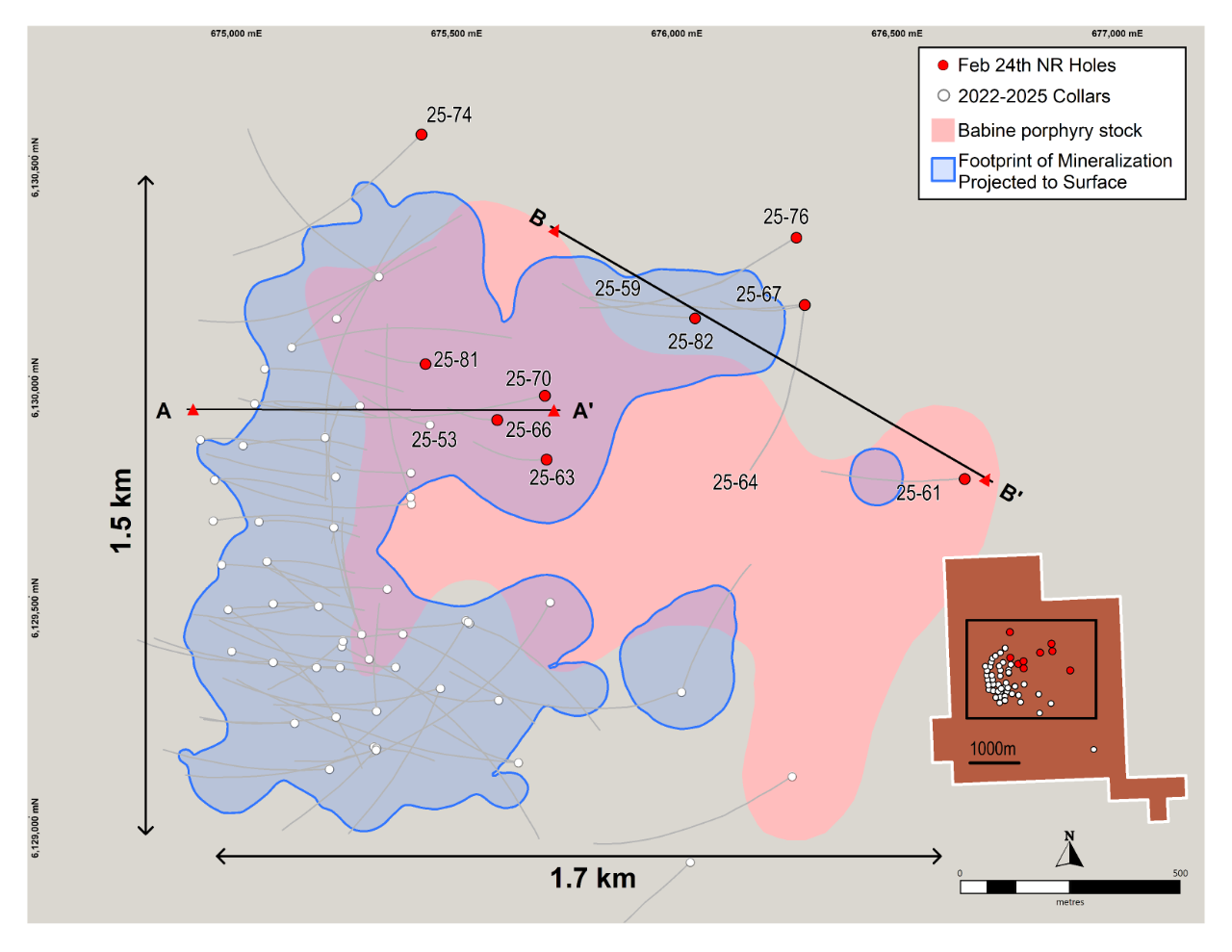 While no mineral resource has yet been defined and it remains too early to determine the complete economic parameters, the lateral and vertical extent of mineralization demonstrated to date places NAK within the size envelope of large, long-life porphyry copper systems globally. The confirmation of pervasive mineralization throughout a large volume of the Babine porphyry stock compels a material shift in the broader targeting strategy and significantly expands the scale of the exploration opportunity.
