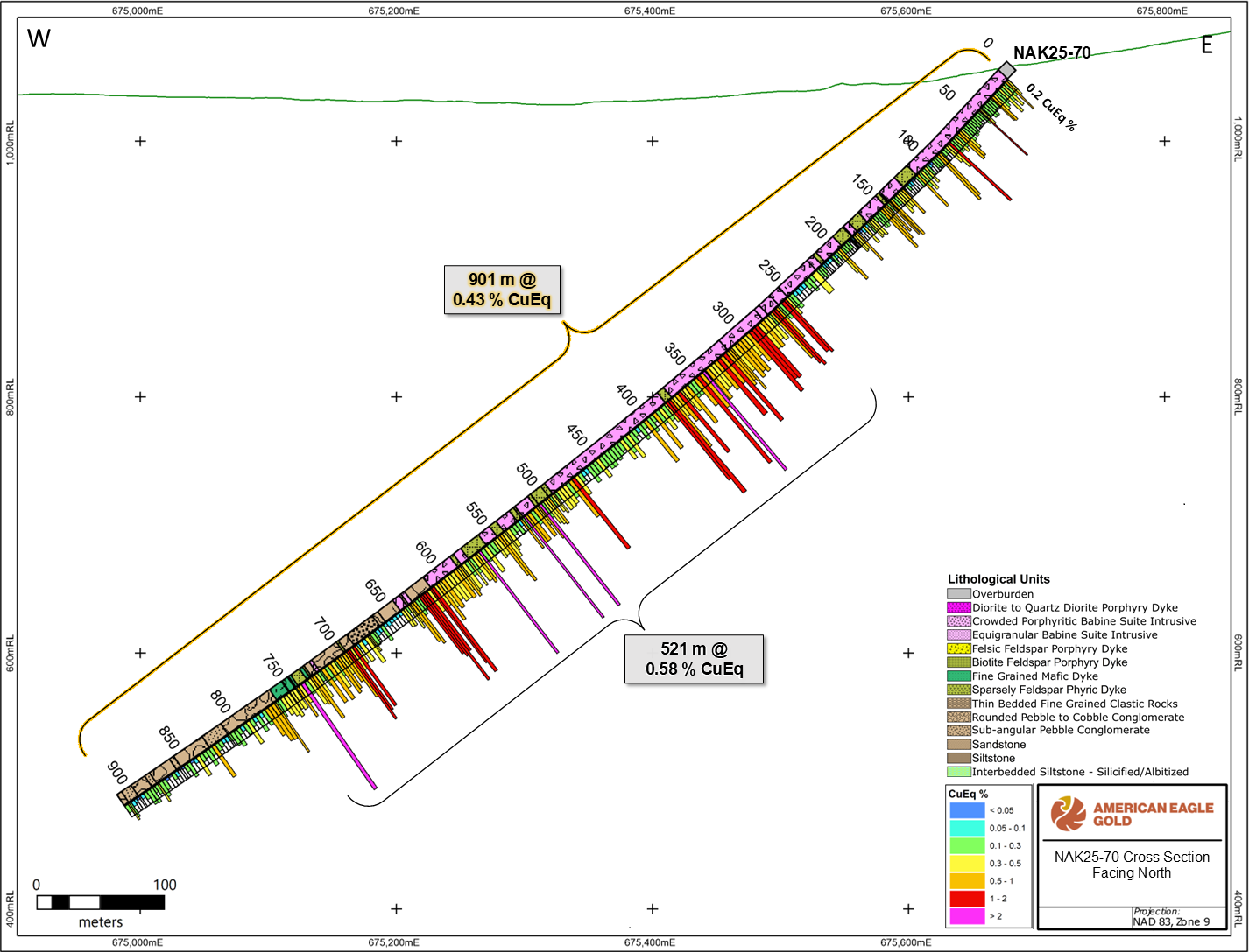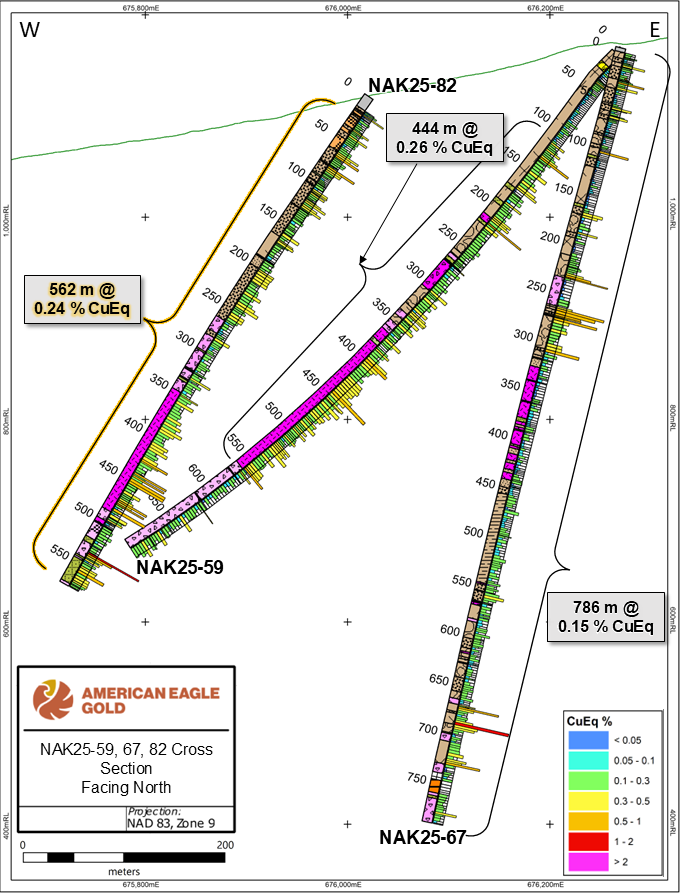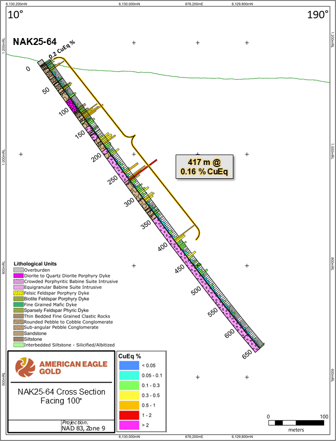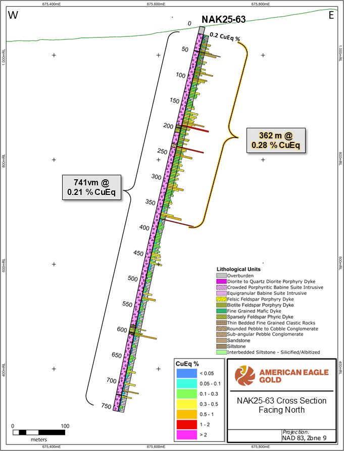 Toronto, Ontario – February 25, 2026 – American Eagle Gold Corp. (AE:TSXV | AMEGF:OTCQB) (“American Eagle” or the “Company”) reports breakthrough drilling at its 100%-owned NAK Project that materially expands the scale and continuity of porphyry stock‑hosted Cu‑Au mineralization.